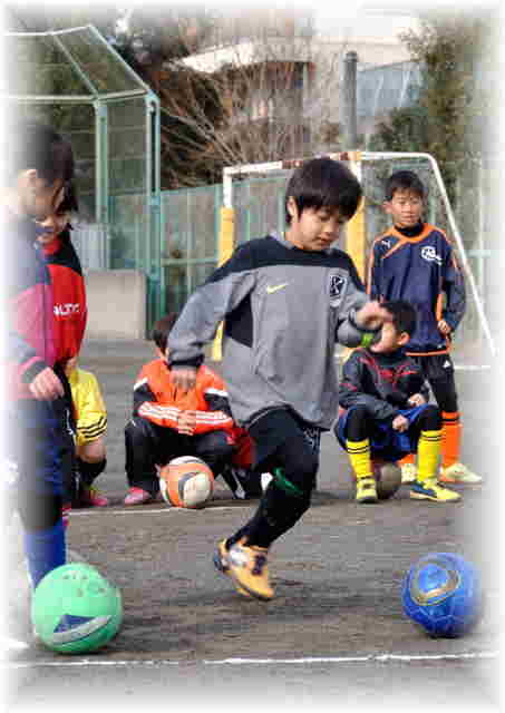 | 次は5年生、だんだん蹴る距離が長くなります。 後ろの6年生は余裕の顔かな? |