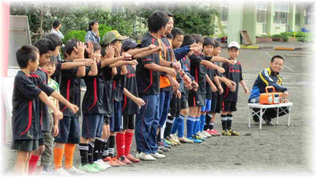 午前中は全員が参加してのチーム対抗フットサル大会ですが、その前に、ケガをしないようみんなで準備運動。