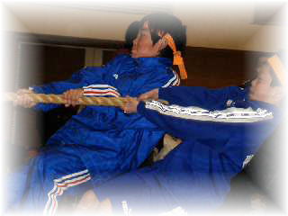 続いてはチーム一丸となっての綱引きです。 オレンジ組と赤組の決勝戦は一進一退の好勝負、身体全体を使って力一杯綱を引き合いました。